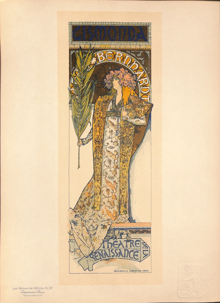 Il fait la rencontre de Sarah Bernhardt. Considérée comme l’une des actrices françaises les plus influentes du XIXe siècle, elle lui commande une affiche pour sa nouvelle pièce, Gismonda. Séduite par son style, elle l’engage pour six ans.