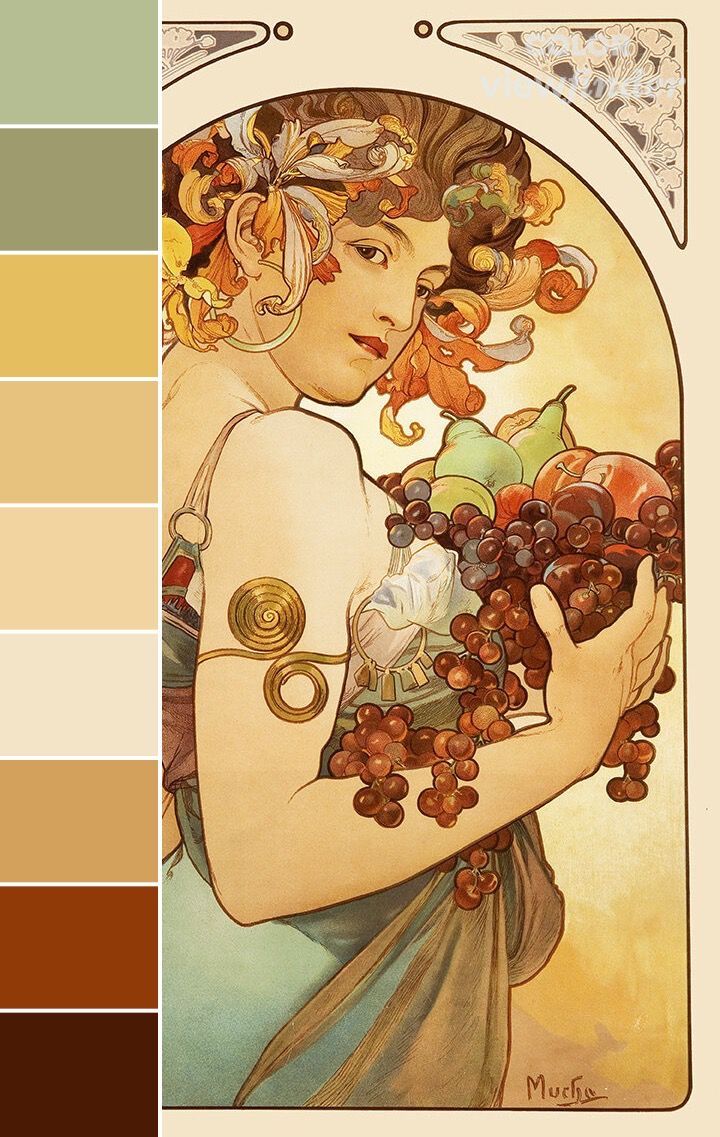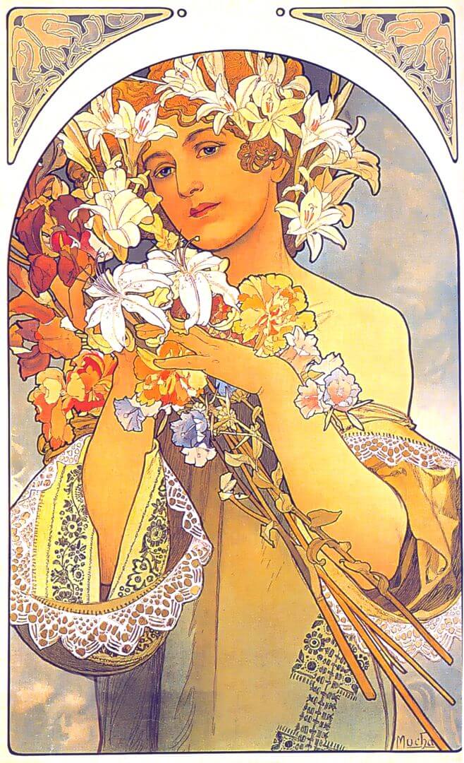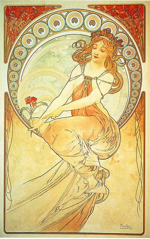 Il s’inspire principalement du travail de William Morris pour ses motifs floraux, mais il reprend également des éléments de l’art byzantin et des estampes japonaises. Il emprunte le format vertical du kakemono japonais et développe une composition dite « formule Q ». Ce mode de composition implique une silhouette inscrite dans un motif circulaire, prolongée par une draperie. Cette formule, très utilisée dans ses illustrations, rappelle les représentations des nimbes dorés dans l’art religieux byzantin orthodoxe. Bien qu’élevé dans une famille catholique, Mucha reste avant tout guidé par des valeurs humanistes et spirituelles.