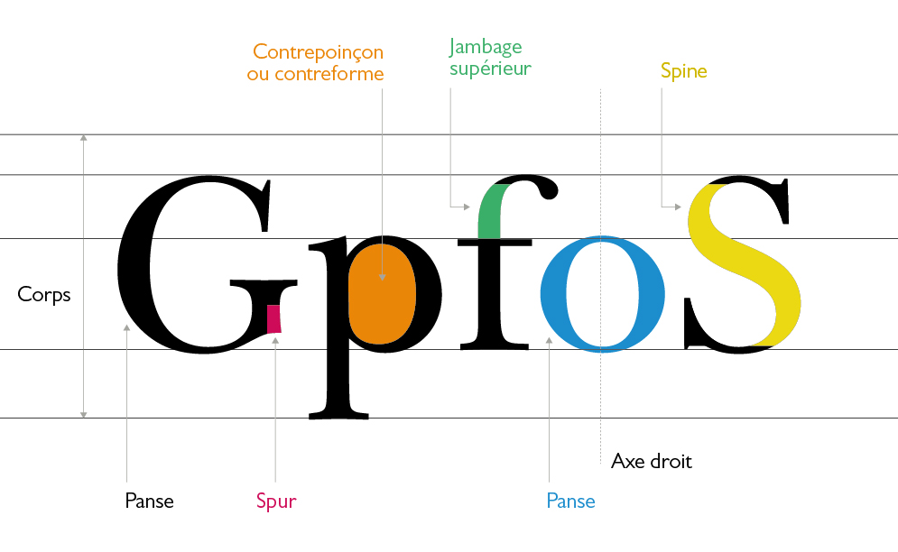 La typographie utilise beaucoup de termes qui permettent de décrire avec une grande précision la partie de la lettre dont on parle. Le champ lexical du corps y est extrêmement présent avec des termes comme : œil, panse, corps, ligne de pied ou encore jambage…