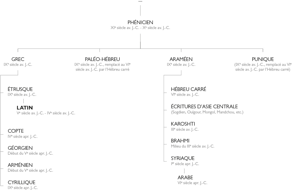 En 2006, Françoise Briquel-Chatonnet a proposé la chronologie suivante pour les écritures alphabétiques :