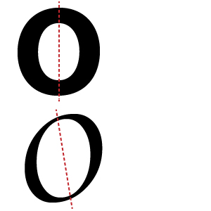 C’est l’axe de construction de la lettre. Un axe droit indique un dessin symétrique de la lettre, sans contraste dans les épaisseurs. Un axe oblique a pour effet d’ajouter du plein et du délié dans l’aspect de la lettre.