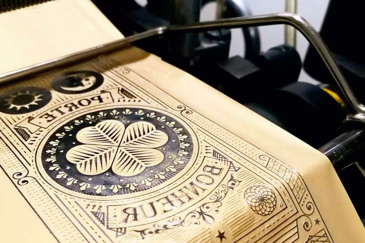 Chaque texte ou dessin est gravé sur une plaque en métal ou en polymère. Une fois encrée, cette plaque vient « frapper » le papier avec une pression de plusieurs tonnes. Contrairement à l’imprimerie moderne qui dépose l’encre à plat, la typographie sculpte la matière : elle crée un creux élégant et tactile que l’on appelle le « foulage ».